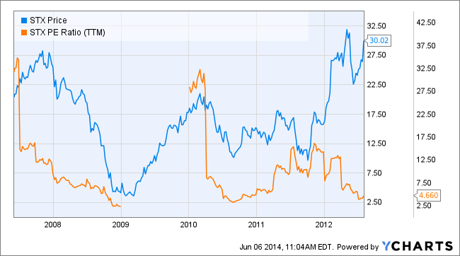 I’ll use my example of Seagate Technology (STX). I bought it in July 2012 after writing my stock analysis. The company suffered from two crises at the same time: the 2008 crash combined with a major flood in their plant in Taiwan. Therefore, in 2007, the stock was trading around $27, dropped as low as $3.61 and was back around $27 in 2012: